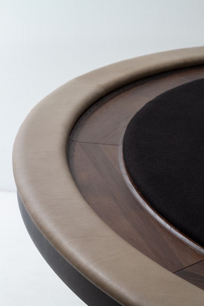 Stół do pokera. Dębowy blat ze skórzaną krawędzią. Podstawa wykonana w całości z żeliwa.
