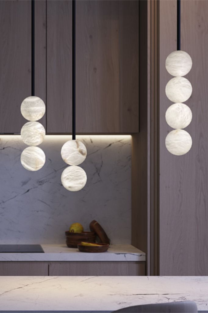 Raïm, lámpara de suspensión con perfecta estética. Sus pequeñas esferas de alabastro colocadas en el mismo eje vertical hacen el modelo Raïm una opción perfecta para iluminar cualquier estancia de una forma muy sencilla.
