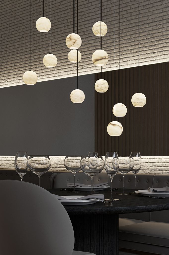 A shower of luminous balls that spreads through space. The Rain Balls suspension lamp with 12 luminaires can illuminate from a large table, a living room or a staircase, depending on the distribution of the shades. This lamp designed in alabaster has a lacquered wooden base and with different possibilities of configuration of finishes in structure and electrical cable. The Rain Balls collection can be suspended from the ceiling in sets of 9 or 12 luminaires to adapt to the lighting to be provided in each space.