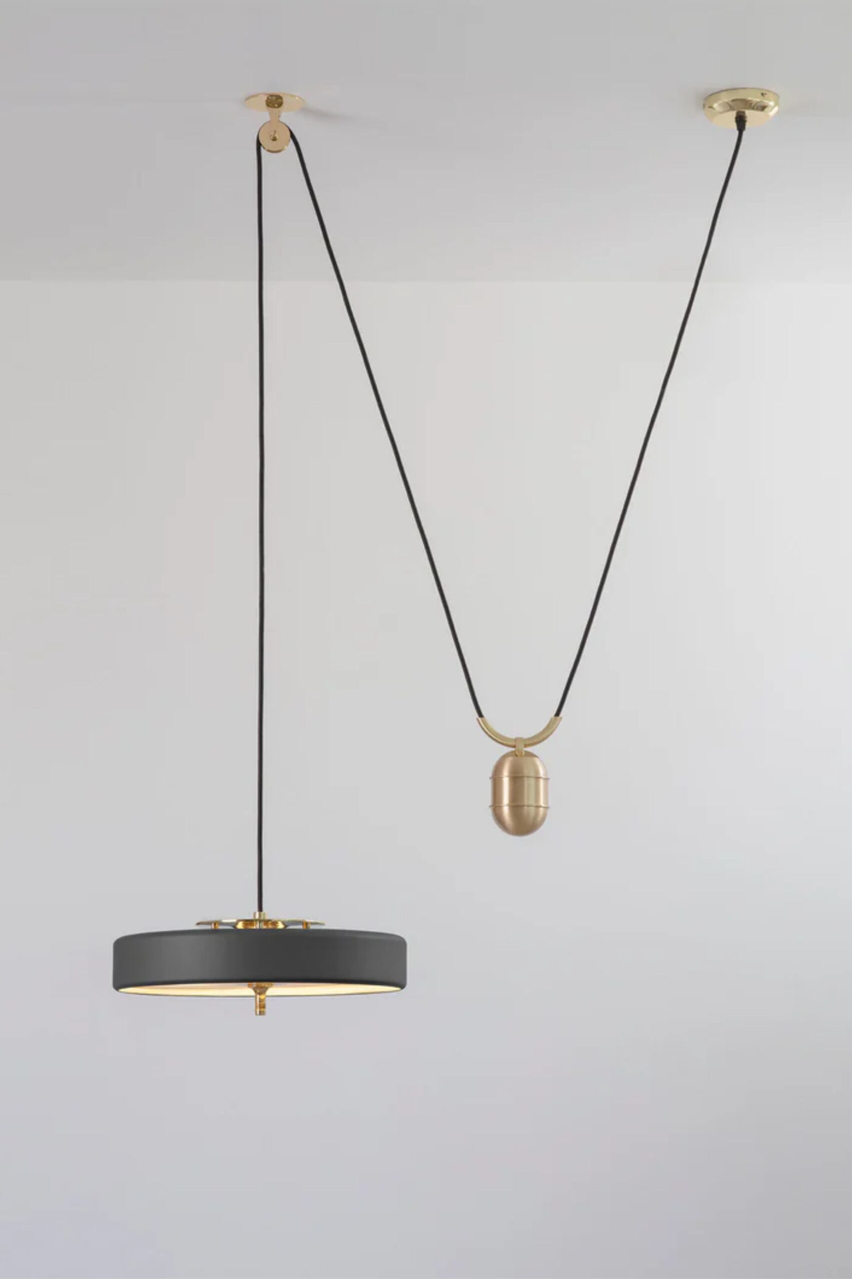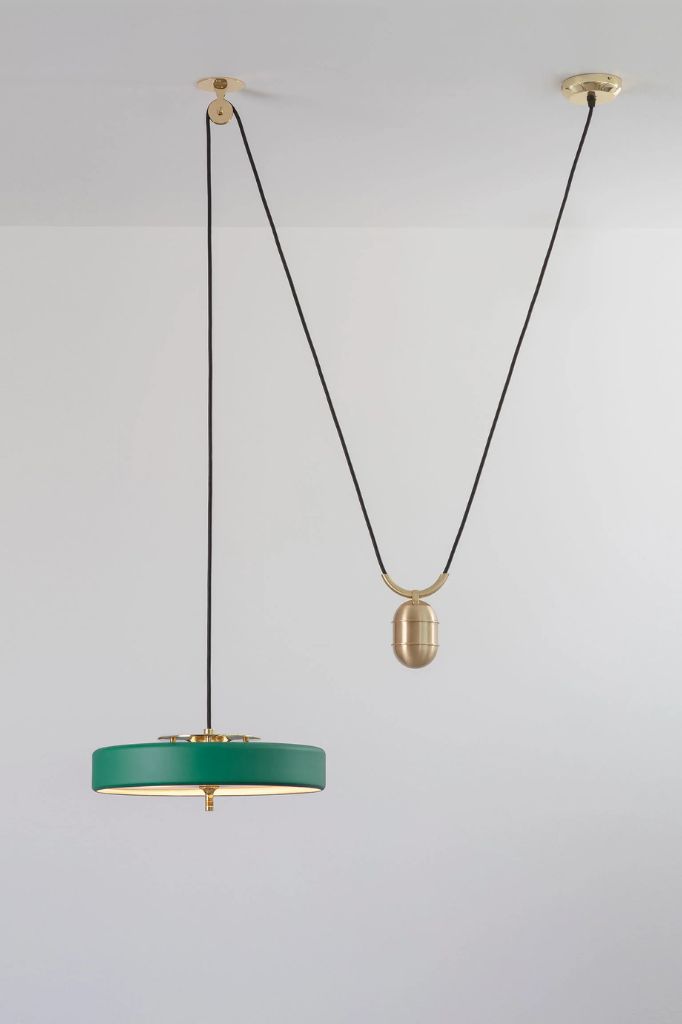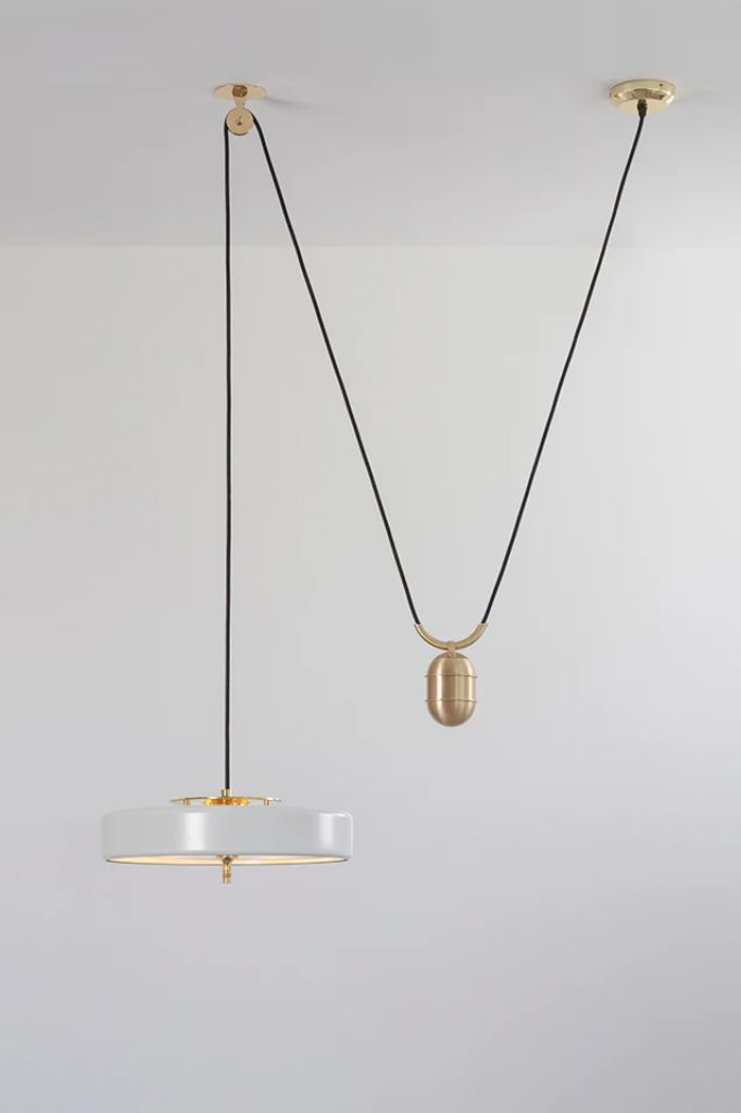 Charakterystyczna lampa wisząca, której wysokość regulowana jest za pomocą solidnego, mosiężnego obciążnika.