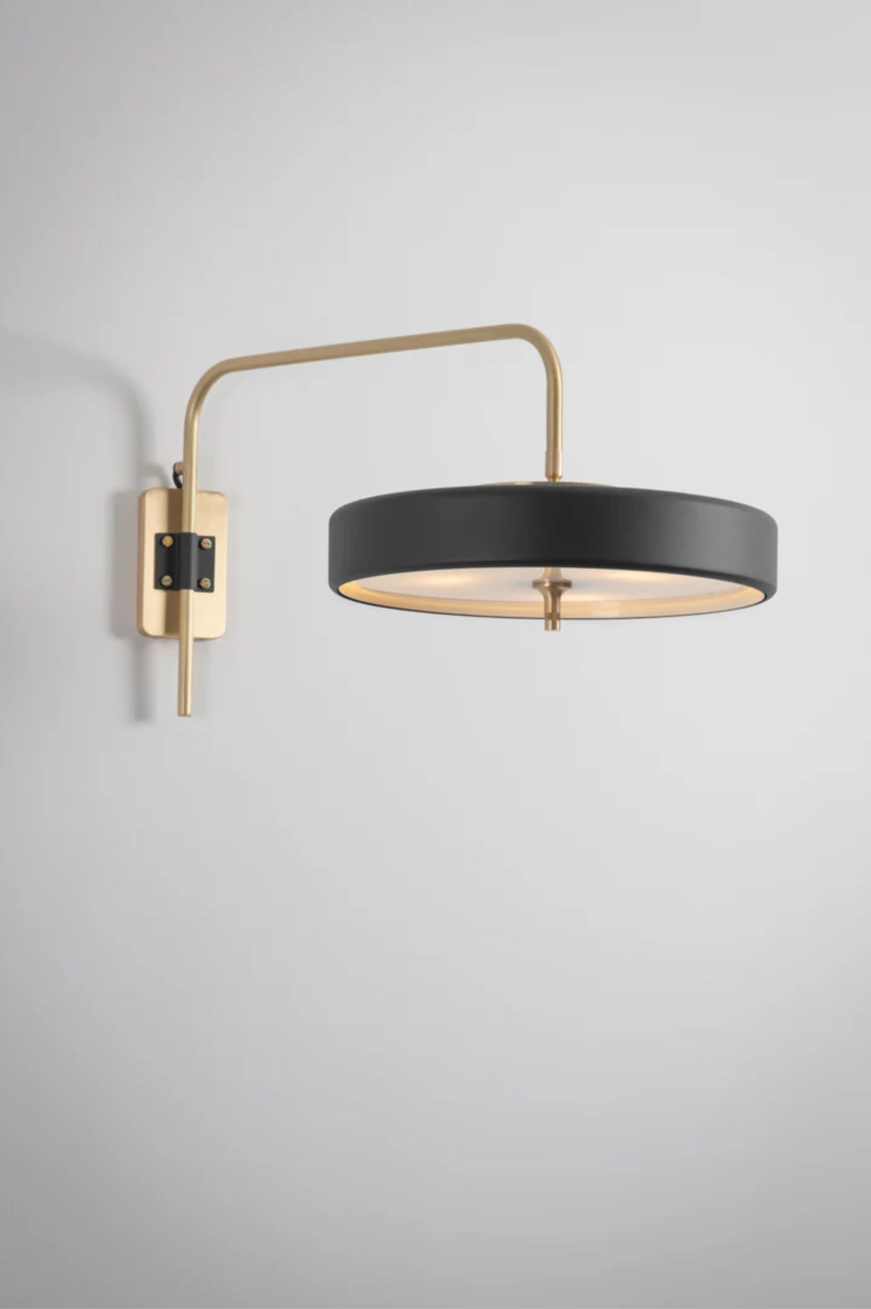 Sleek, minimalist design. Designed to rotate through 90 degrees in a perfect arc from the wall for maximum flexibility. Casts a soft, warm light from an opal diffuser, framed in a matte-lacquered spun-metal shade.