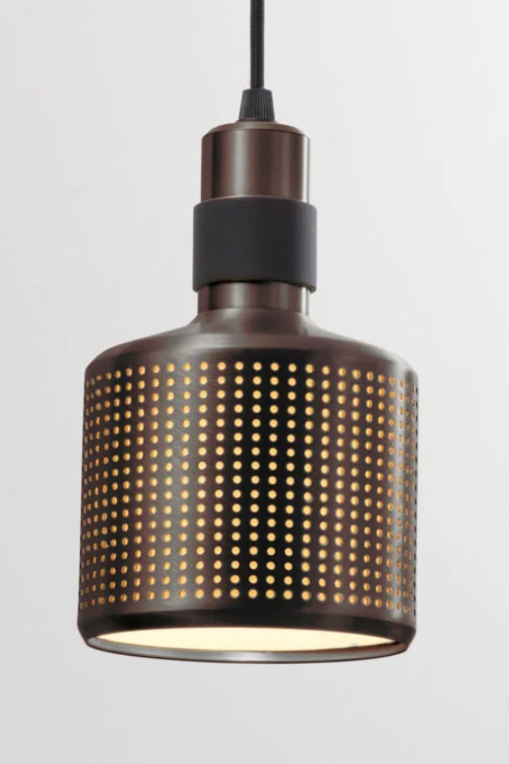 Perforowany klosz z tłoczonego mosiądzu z materiałową wstawką rzuca miękkie, ciepłe światło.