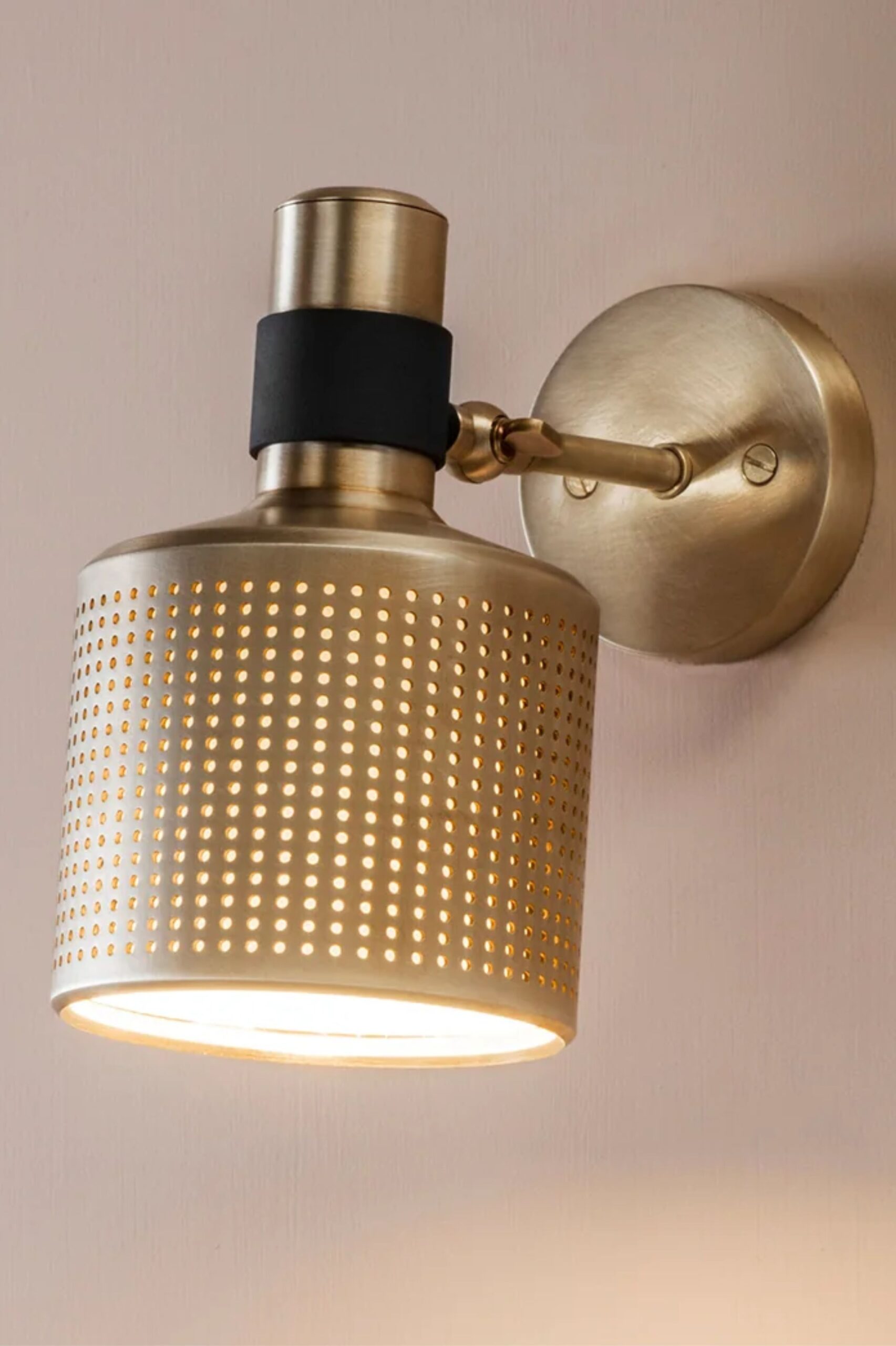Regulowany, perforowany klosz z mosiądzu obrabianego maszynowo z wkładką z tkaniny emituje miękkie światło, które można skierować na ścianę lub ustawić tak, aby podświetlić wybrany obszar.