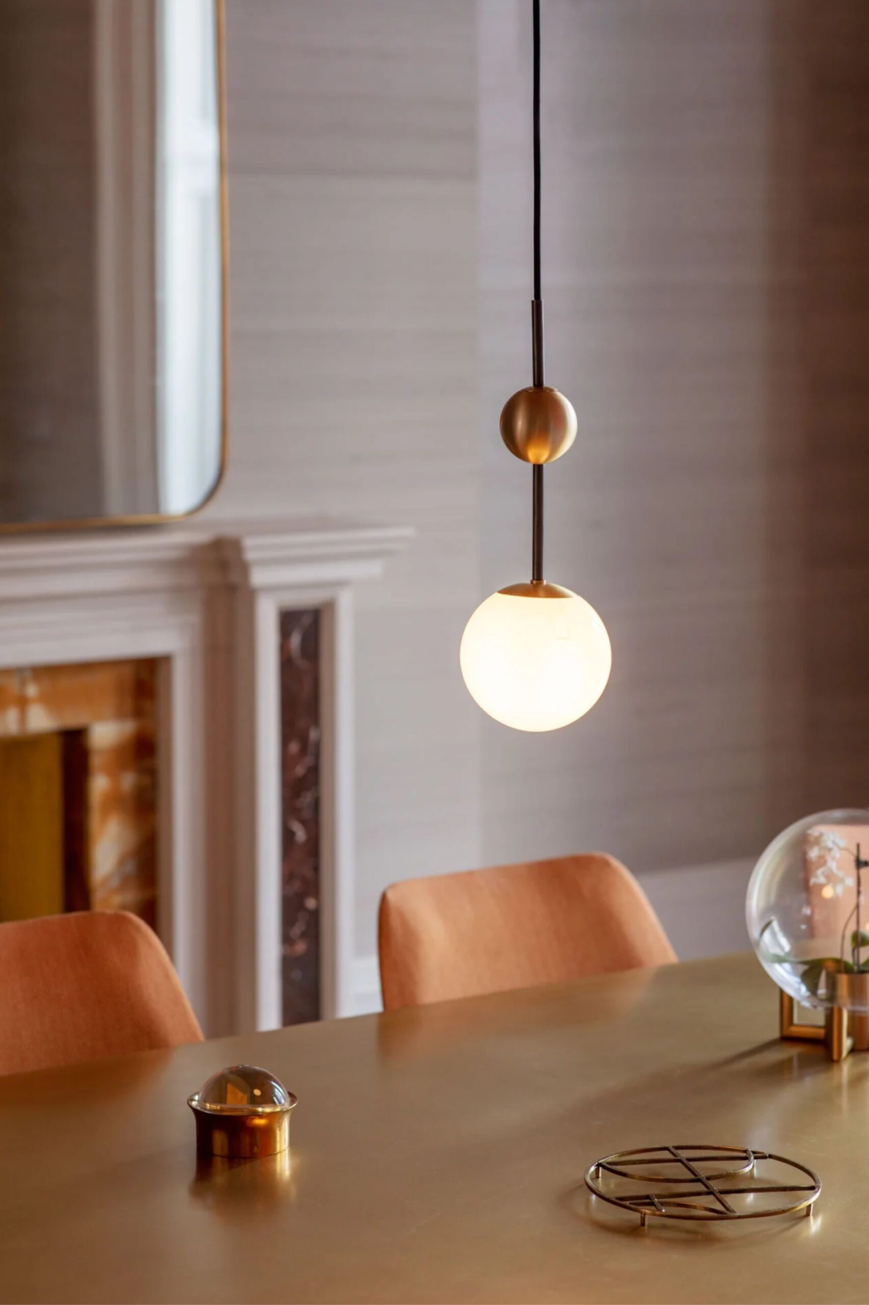 Czysty i wyrazisty design – zasadniczo niewielka mosiężna kula umieszczona nad większą kulą wykonaną z matowego szkła – który bawi się formą i równowagą.