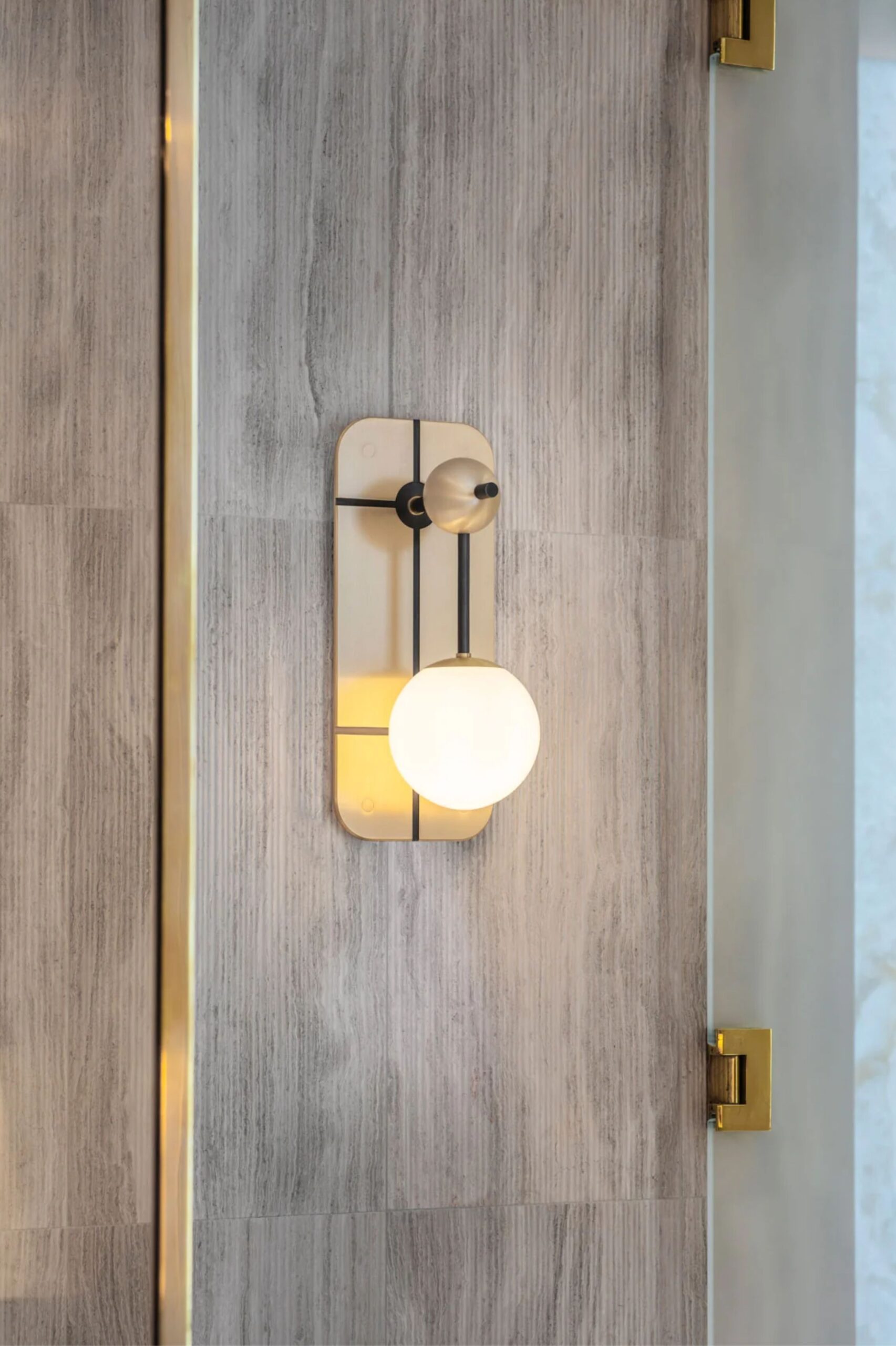 Kula z matowego szkła zawieszona poniżej mosiężnej kuli przypiętej do solidnej mosiężnej tylnej płyty z wyrazistymi, geometrycznymi wycięciami.