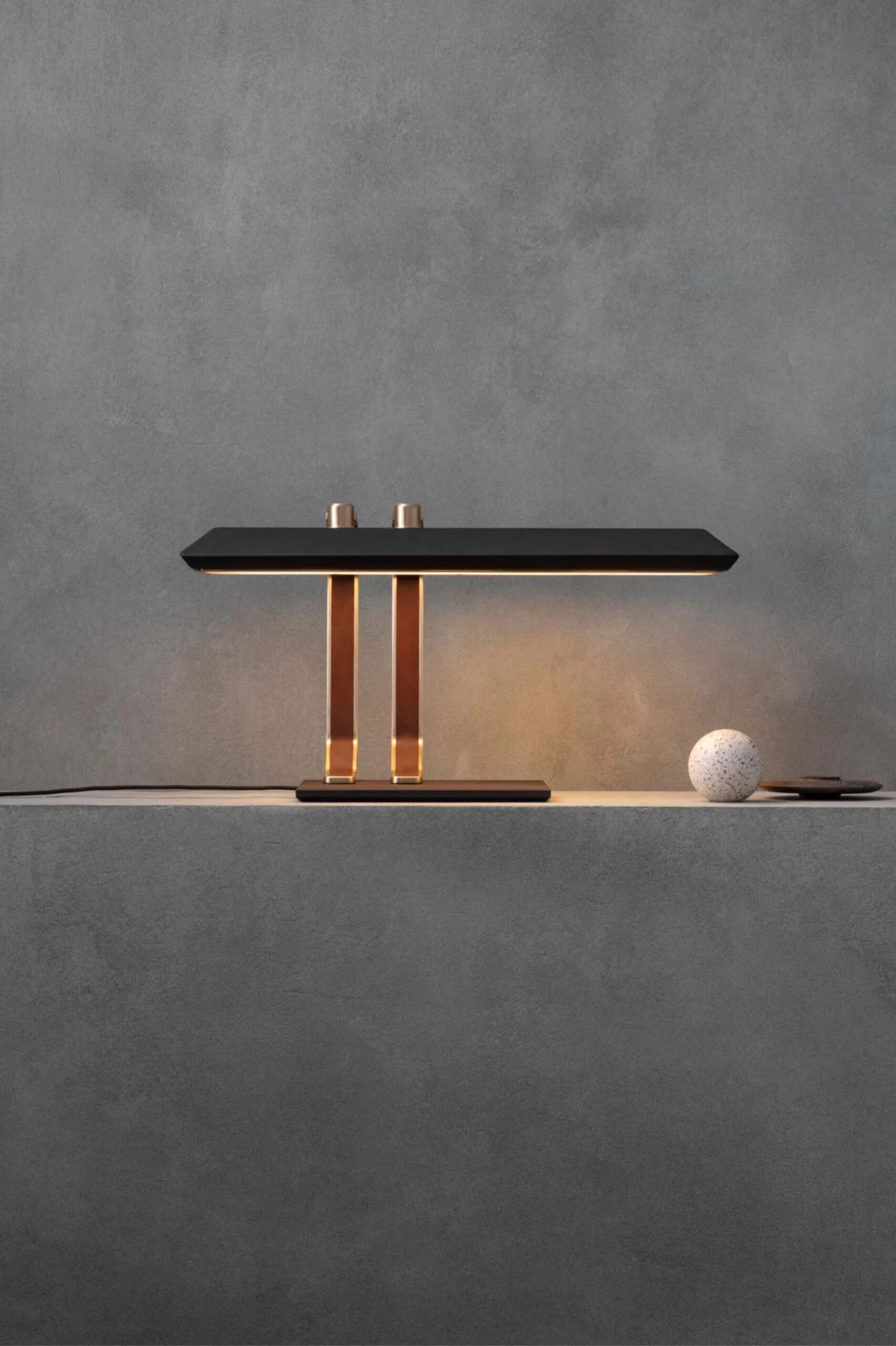 Wydłużony klosz ze stali nierdzewnej, wsparty o asymetryczną metalową konstrukcją i solidną mosiężną podstawą. Dostępne w wielu różnych wykończeniach i kolorach, co zapewnia osobisty, wyrafinowany akcent.