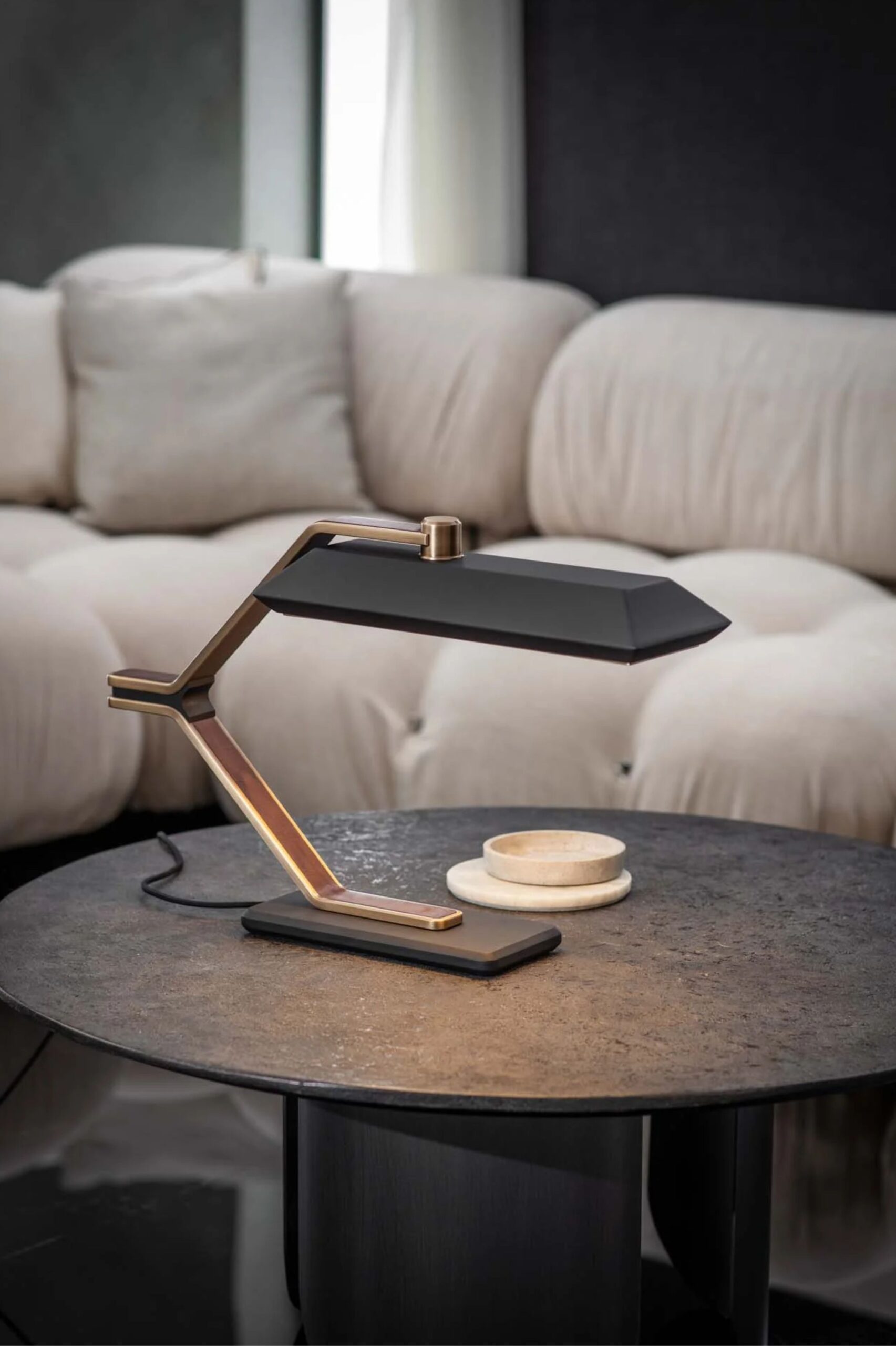 Charakterystyczna rama lampy stołowej Rinato połączona z malowanym pudrowo kloszem ze stali nierdzewnej, wsparta na solidnej mosiężnej podstawie. Klosz i metalowa konstrukcja lampy stołowej są dostępne w wielu różnych wykończeniach.