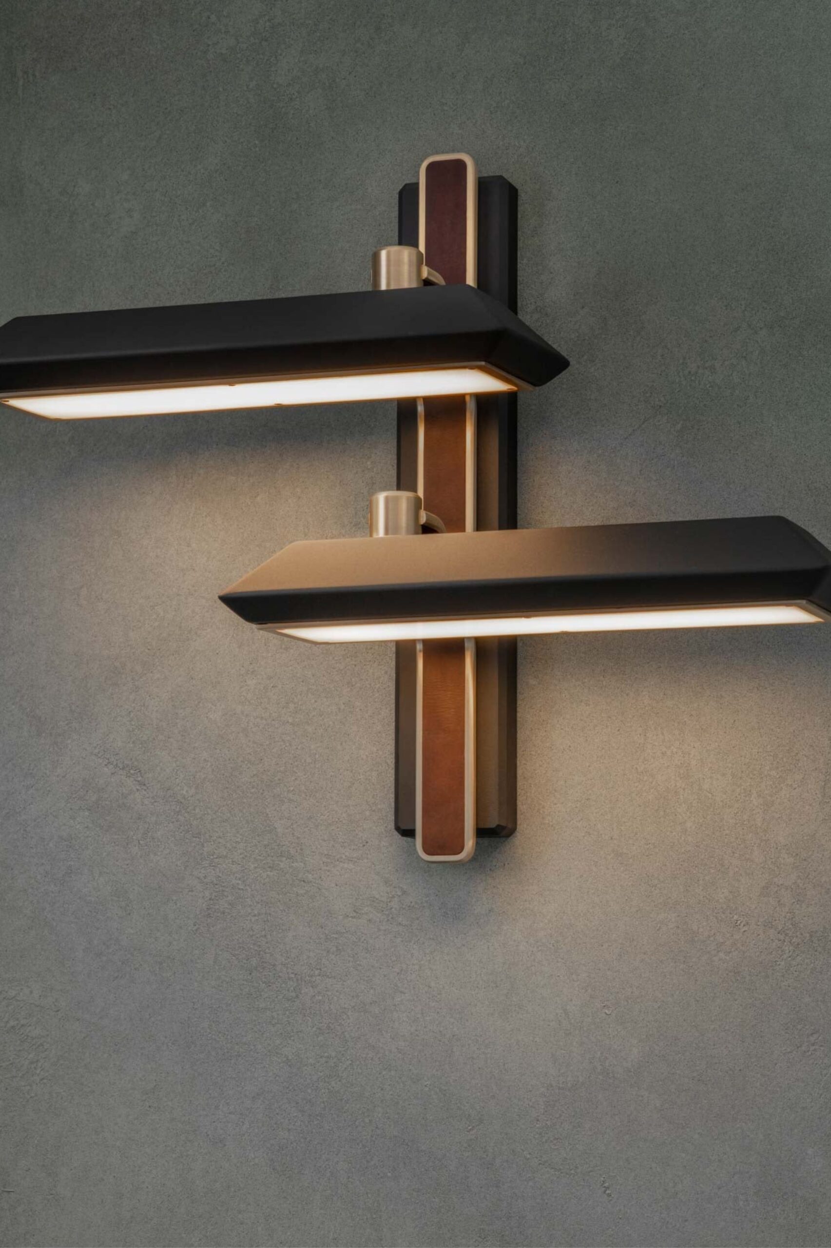 A statement wall light with purpose – the Wall Light Double features two signature stainless-steel shades fixed asymmetrically and opposing each other on its metalwork frame.