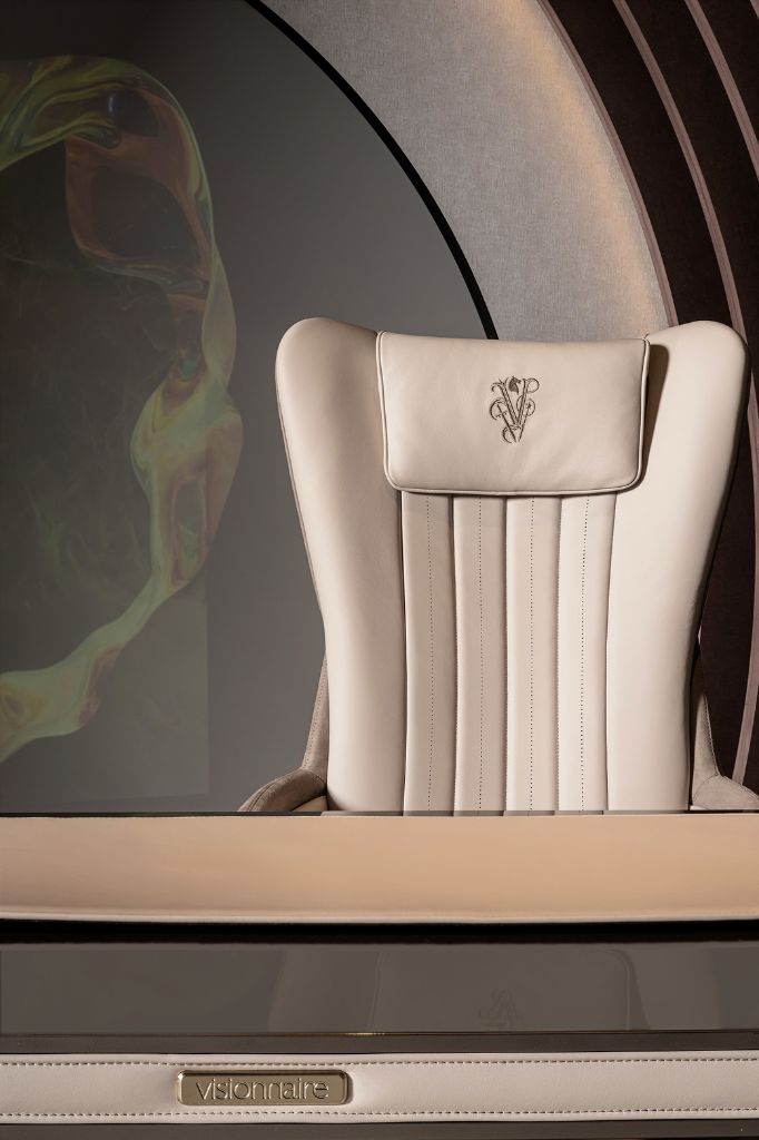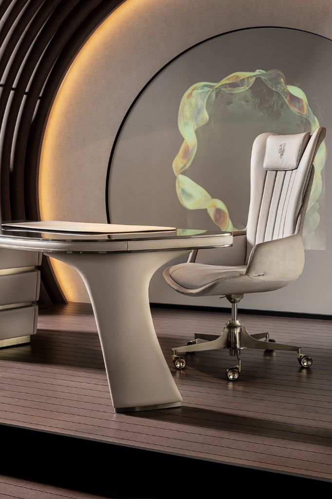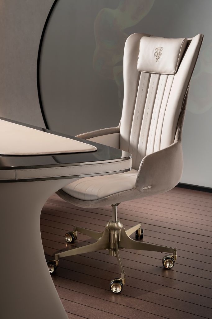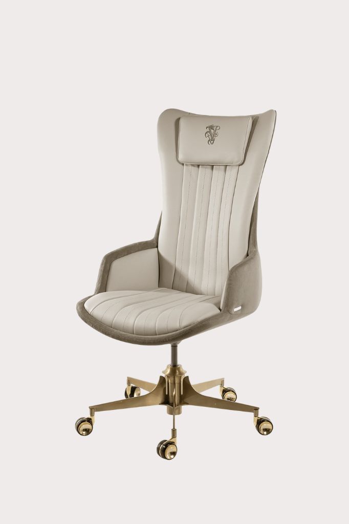 Upholstered office armchair with a slim curved wooden shell, upholstered in leather or fabric, also available in a two-tone combination. In the leather version, the backrest features vertically perforated and quilted bands. The embroidered headrest and five-star swivel steel base complete the design with functional details and carefully selected metal finishes.