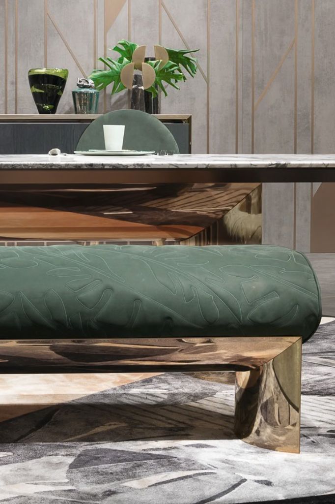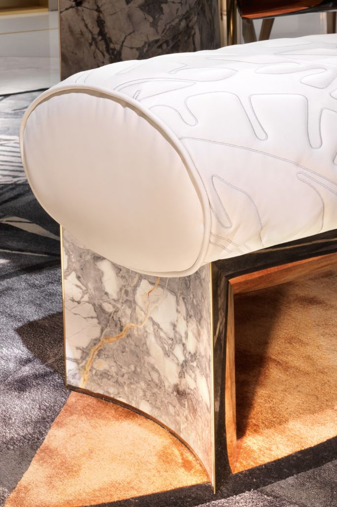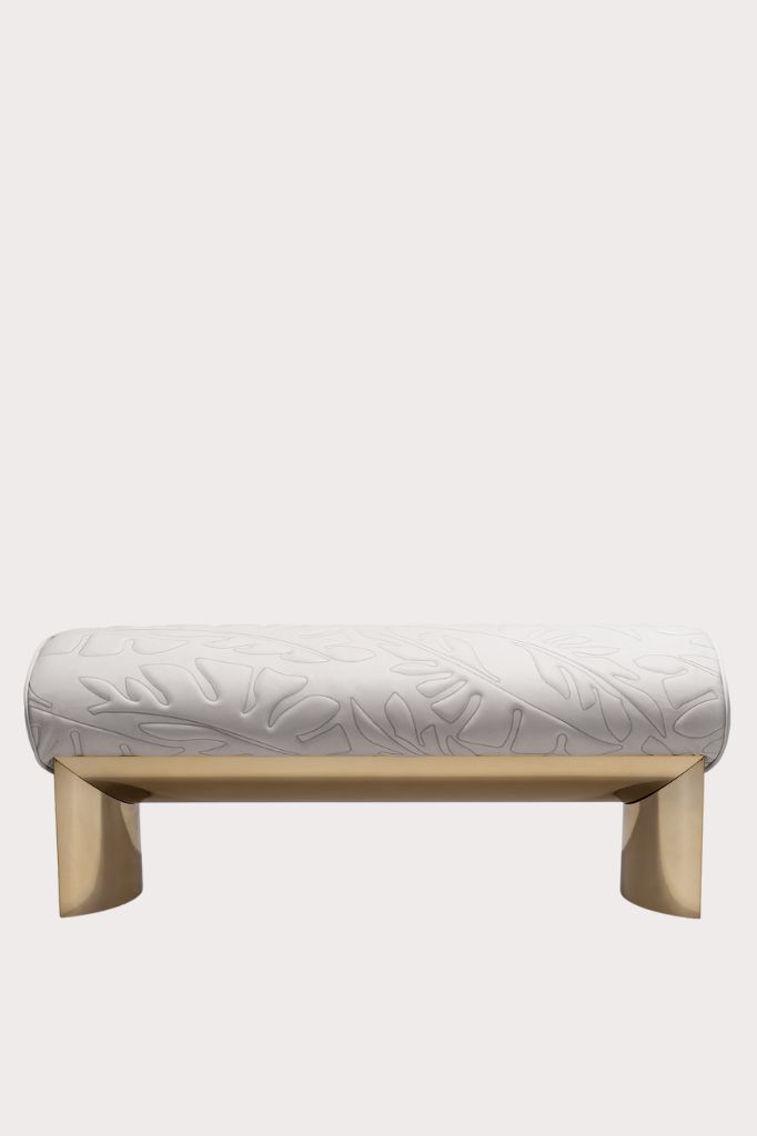 Upholstered bench with a linear seat in leather or fabric, also available in a “quilted” version with lightly padded foliage embroidery. The base is clad in curved polished stainless steel, while the side elements, in sculpted solid marble, feature a concave form. The steel parts are available in the curated selection of metal finishes.