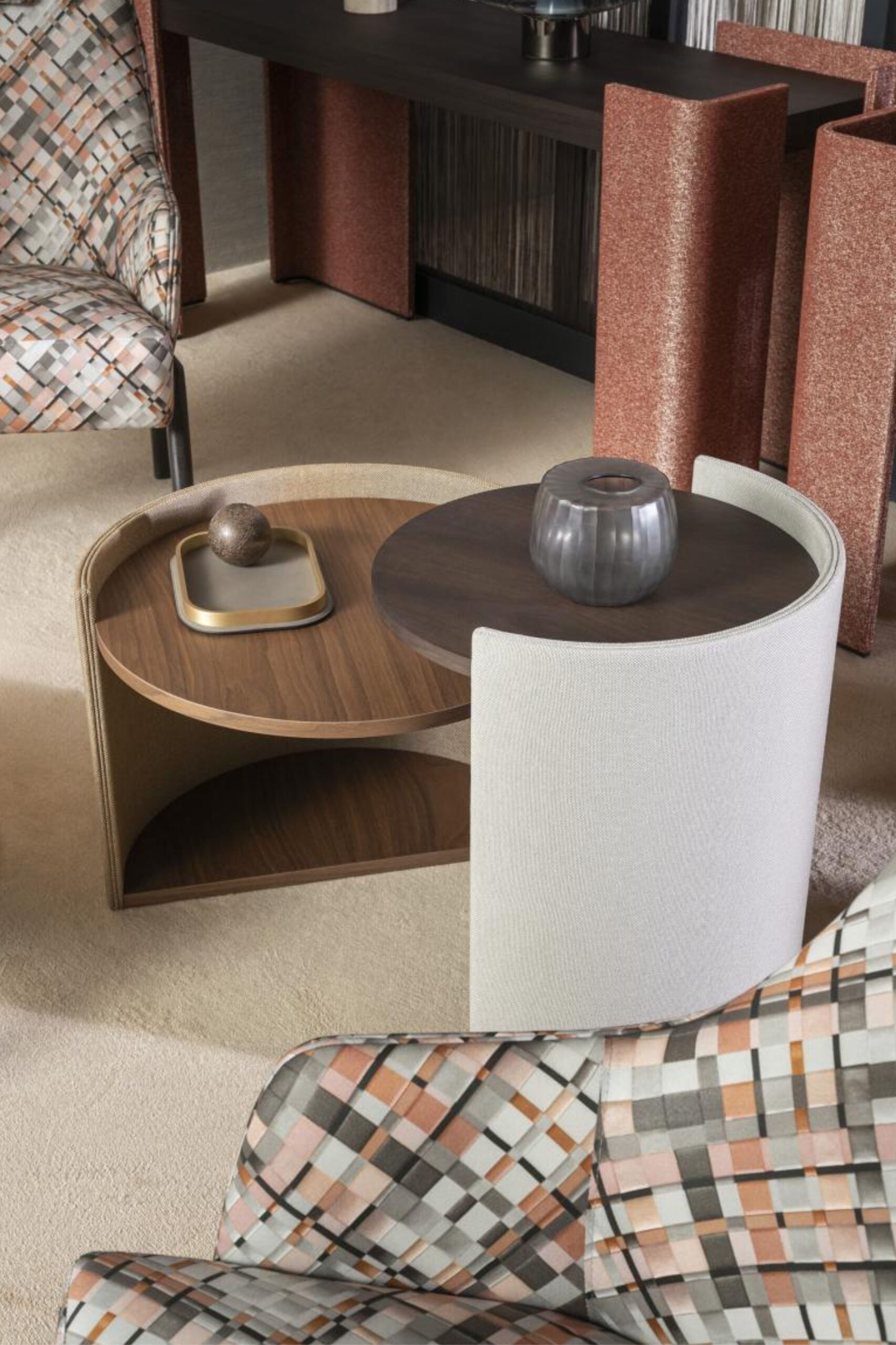 The distinctive element of Sinua collection is the contrast between the linearity of the natural walnut tops on the inside and the soft curves of the fabric panels on the outside.SILVANA LOUNGE