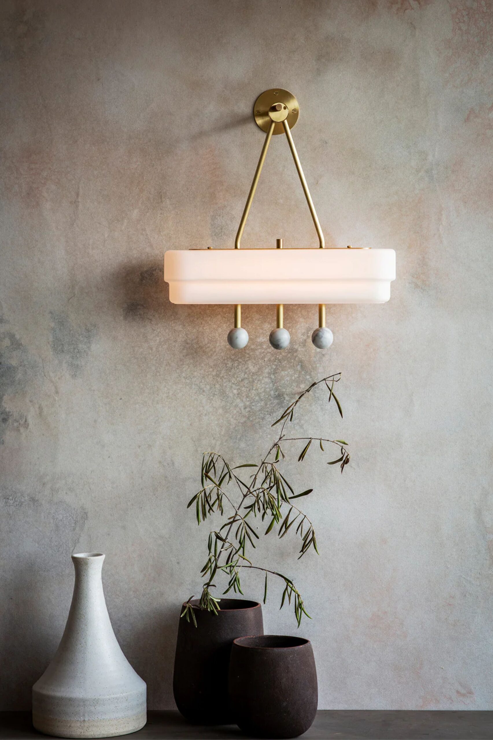 Wyraźny ukłon w stronę stylu Art Deco z miękkim, opalowym, wytrawionym kwasem szklanym kloszem, satynową metalową konstrukcją z mosiądzu i białymi, przypominającymi klejnoty kulami z marmuru Carrara lub Gwatemala.