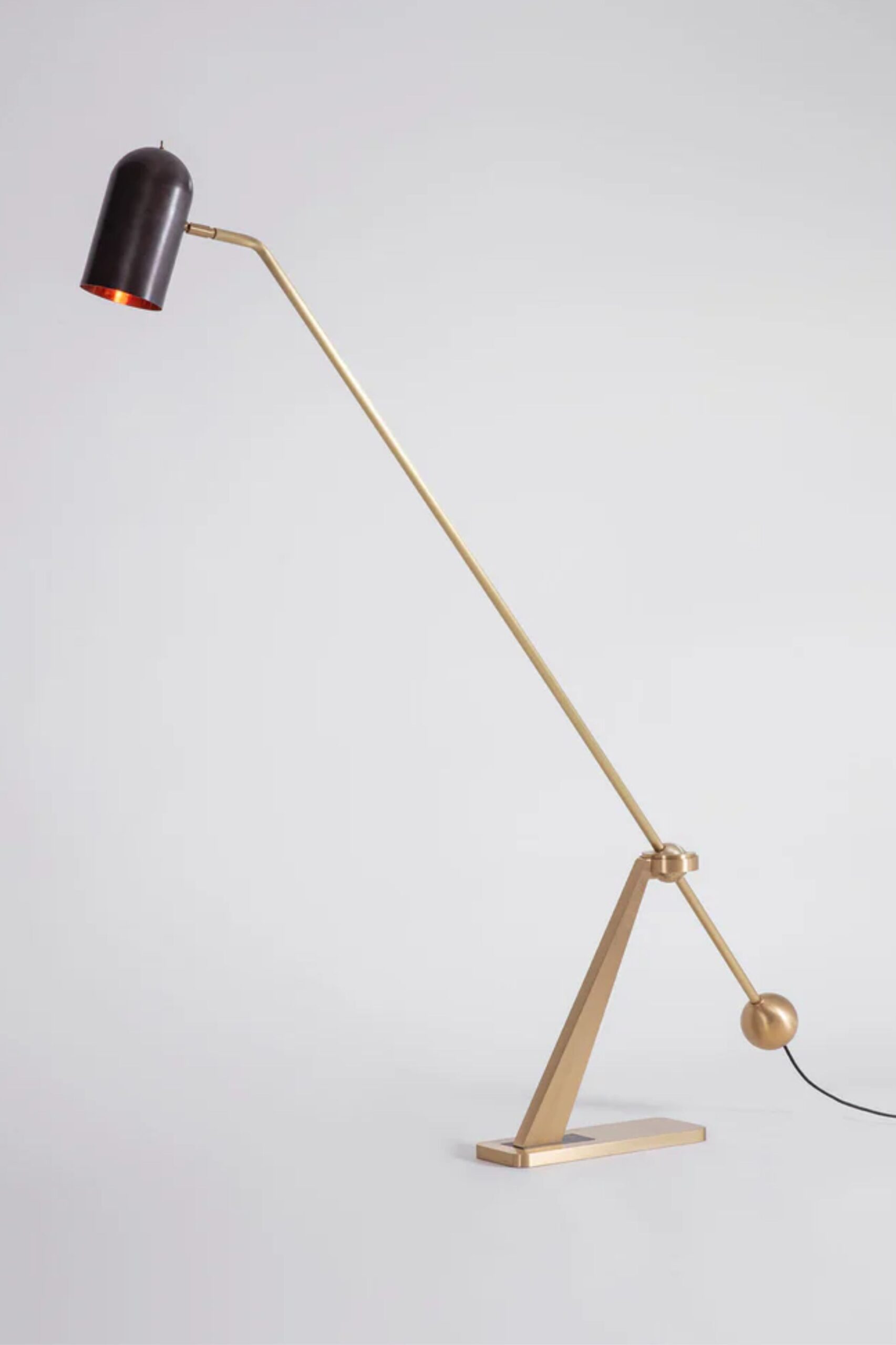 Ostre linie łączą się z eleganckimi krzywiznami. Solidna, ciężka mosiężna podstawa z wkładką z brązu lub miedzi. Kątowe mosiężne ramię z kulistą mosiężną przeciwwagą i przegubem kulowym. Klosz z polerowanej miedzi lub brązu zapewnia kierunkowe światło. Regulowane ramię i klosz.