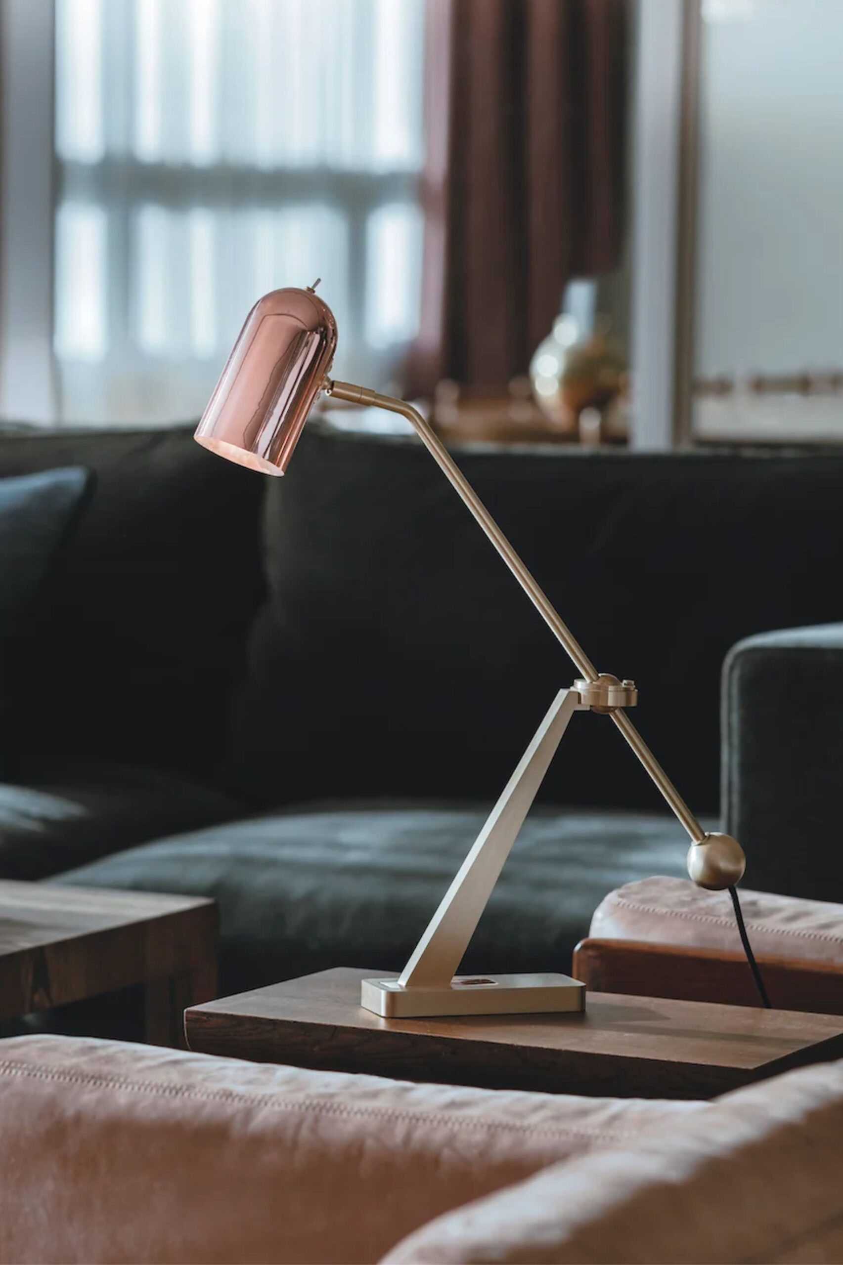 Linear brass arm, curvaceous copper or bronzed shade. Solid brass back plate with coordinated insert detail. Adjustable arm and shade.