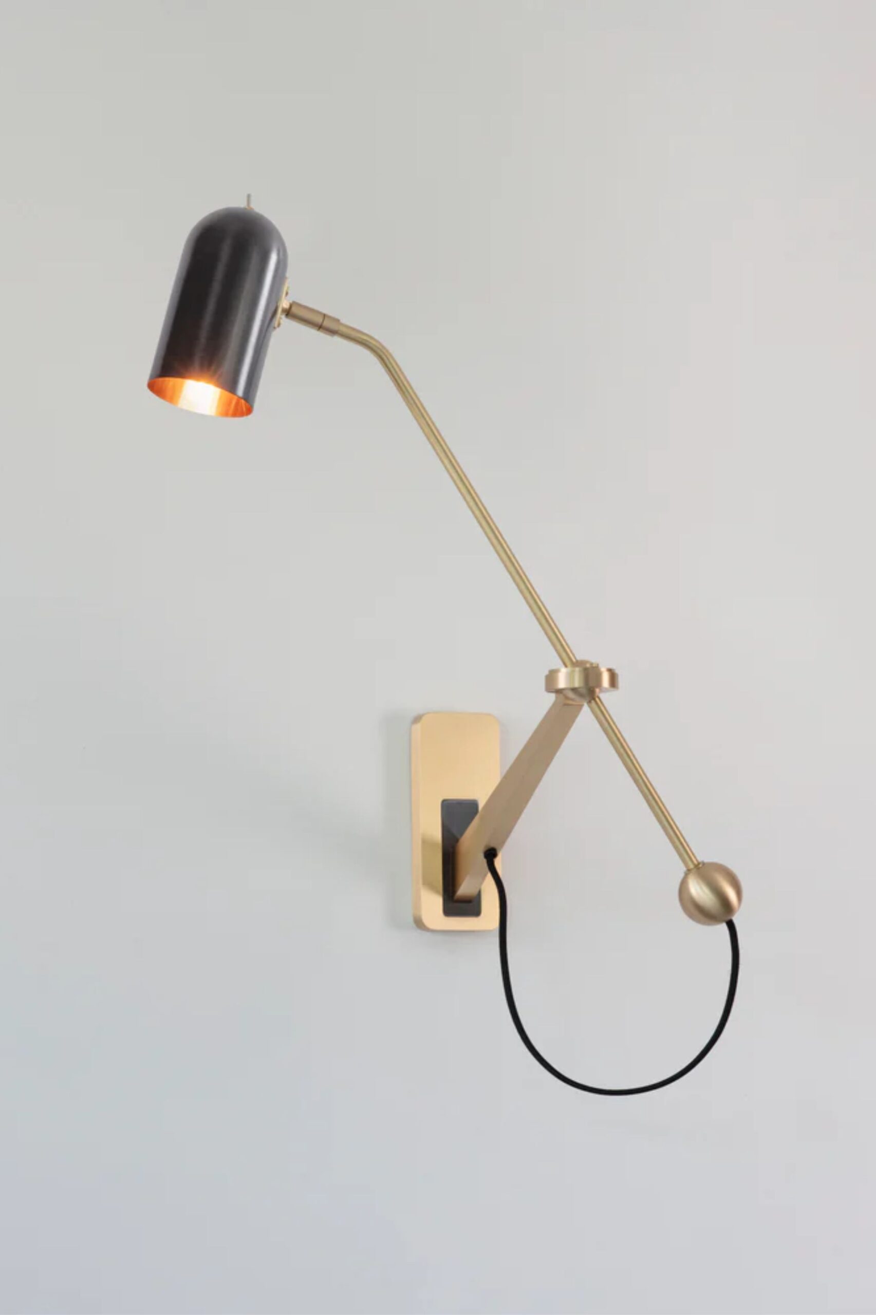 Linear brass arm, curvaceous copper or bronzed shade. Solid brass back plate with coordinated insert detail. Adjustable arm and shade.
