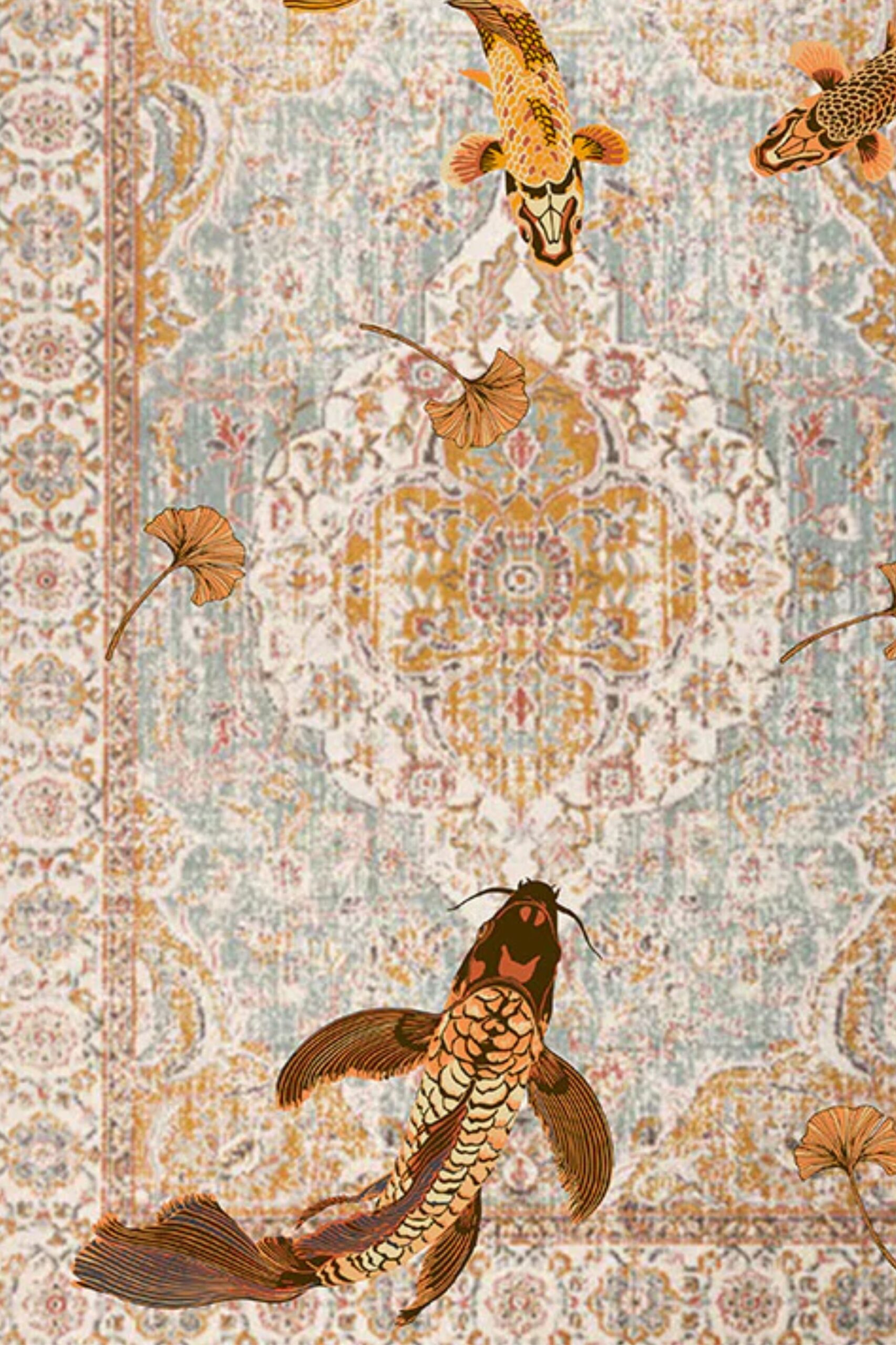 The koi carp is a symbol of perseverance, strength, and good luck in various Asian cultures, particularly in Japan. The use of viscose creates a luxuriously soft and shiny feel.