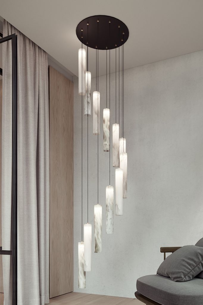Zestaw alabastrowych cylindrów zawieszonych na różnych wysokościach. Projekt niezwykle efektownej lampy wiszącej, która doskonale pasuje do hotelowych holi lub centralnych przestrzeni w dowolnym stylu. Elementy mocujące zostały zaprojektowane i wykonane z litego mosiądzu.