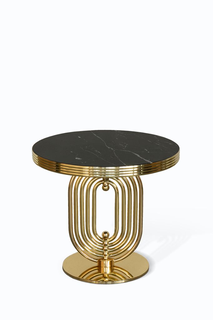 Janis is an art deco side table that exudes the glamour of the 20s and 30s. With perfectly polished marble top and carefully handcrafted metal, its intricate design adds a touch of luxury to any living space.KELLY DEMILUNE BAR CHAIR
