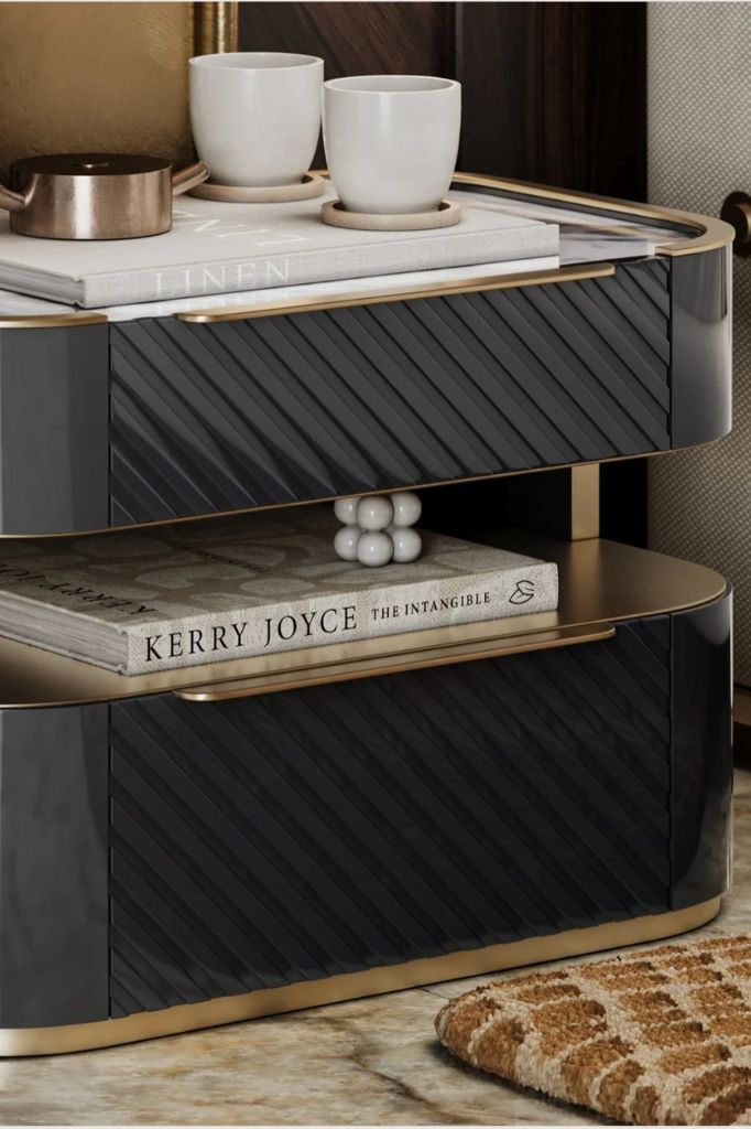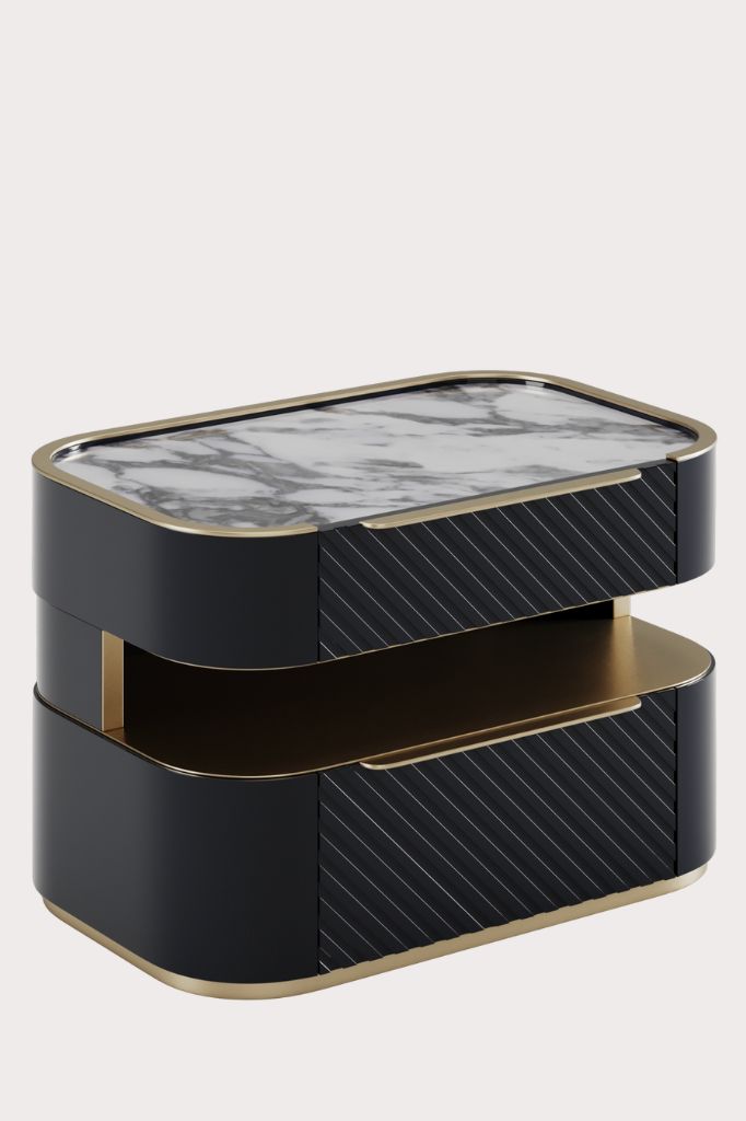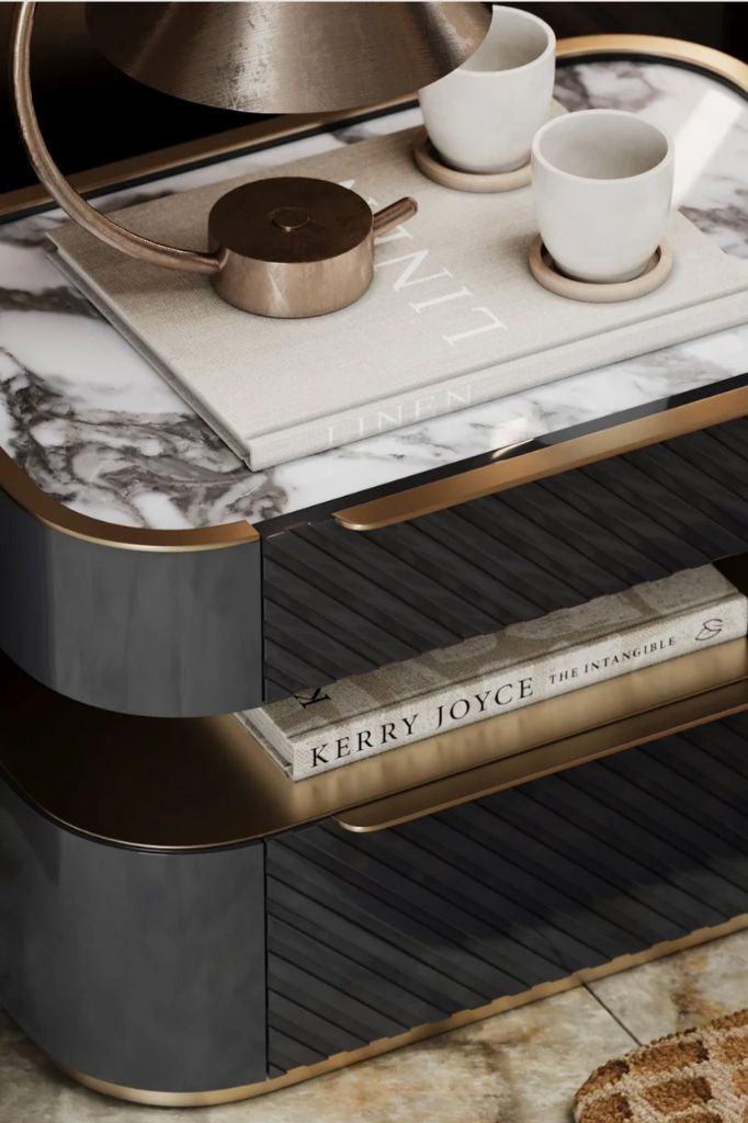 Side table with Calacatta Viola marble base, brushed brass structure, and handcrafted glass top.świat bronson: