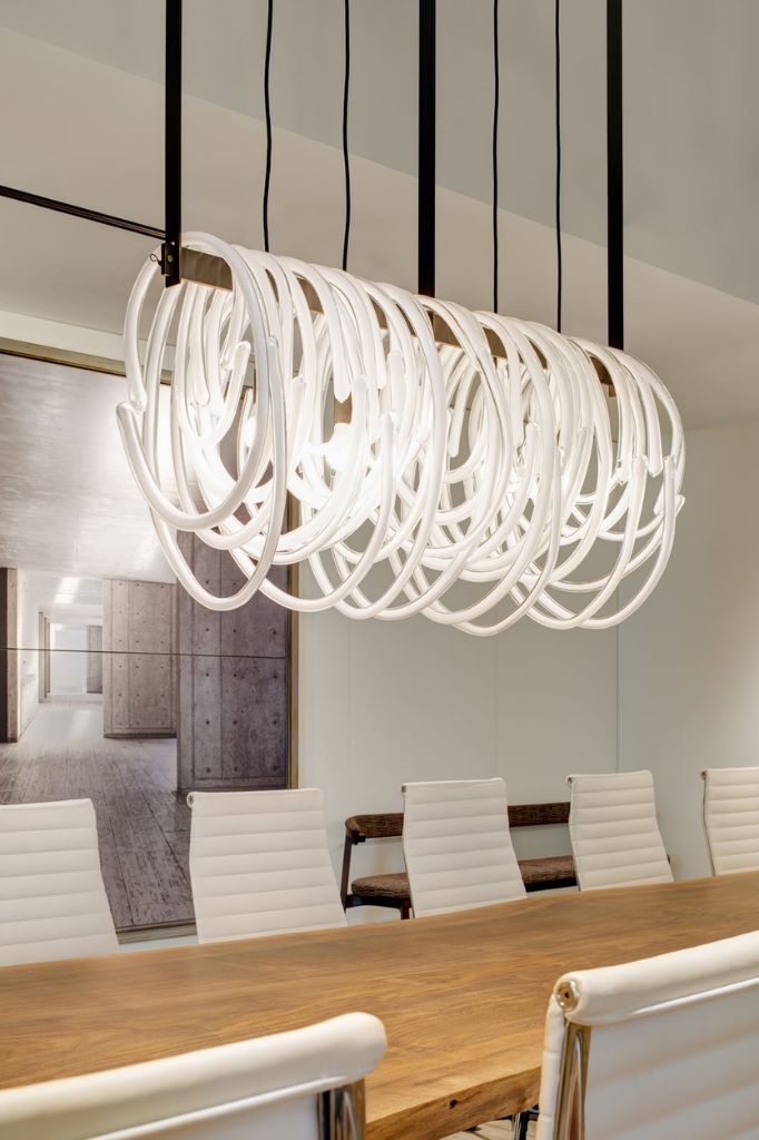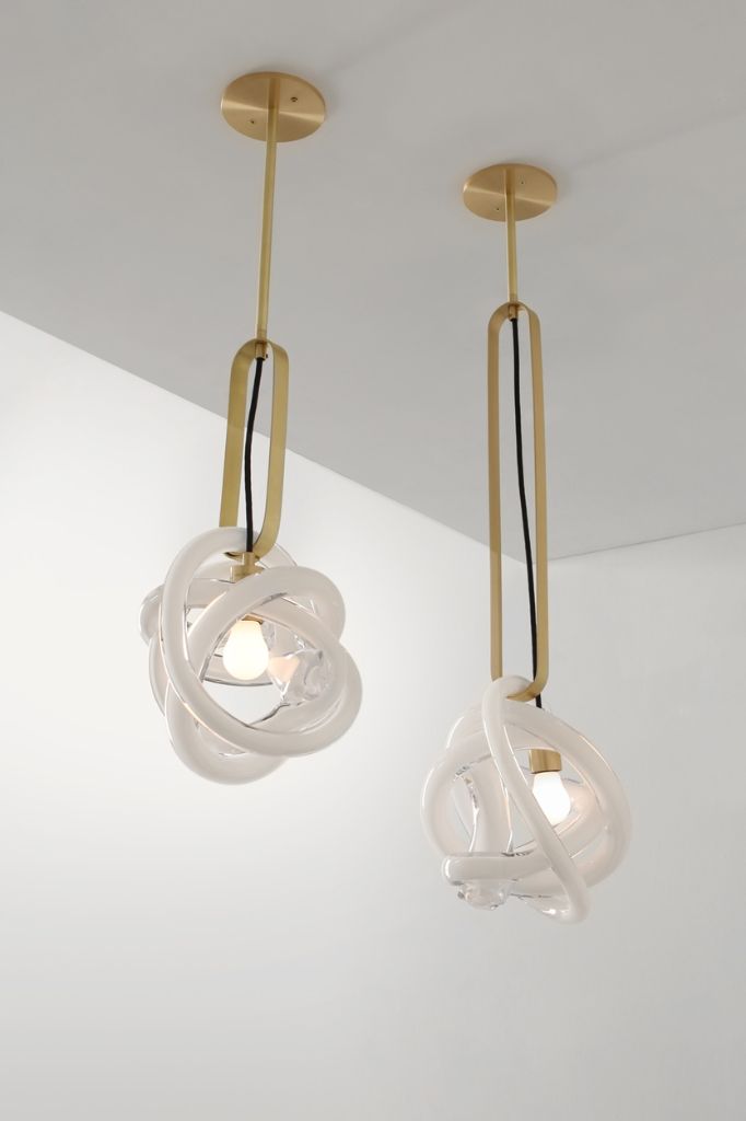 Duża, geometryczna oprawa oświetleniowa z długim rzędem szklanych pętli wspartych na stalowej konstrukcji. Każda z nich jest wykonywana ręcznie, więc każda jest wyjątkowa i nieco inna, nadając gotowej kompozycji bardzo organiczny charakter.