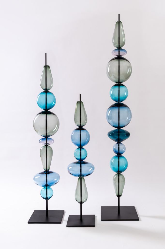 SkLO Stack to wieże ręcznie dmuchanych szklanych kształtów zamocowanych na stalowym stojaku. Dostępne w trzech różnych rozmiarach, a każdy rozmiar składa się z określonej kombinacji.